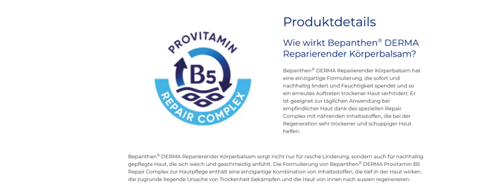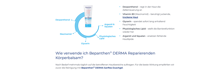 Bepanthen® DERMA Reparierender Körperbalsam pflegt sehr trockene und schuppige Haut und schützt nachhaltig gegen extreme Hauttrockenheit.