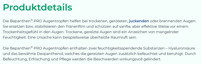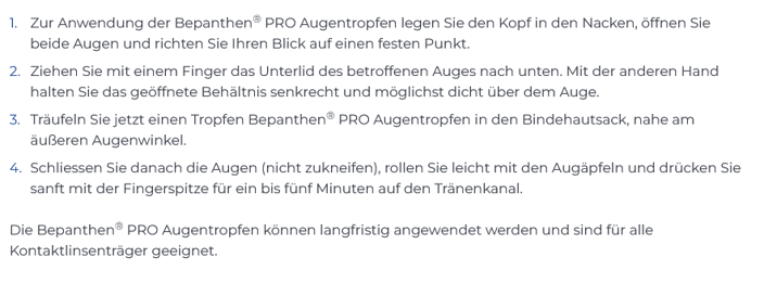 Die Bepanthen® PRO Augentropfen enthalten keine Konservierungsstoffe und sind deshalb sehr gut verträglich.