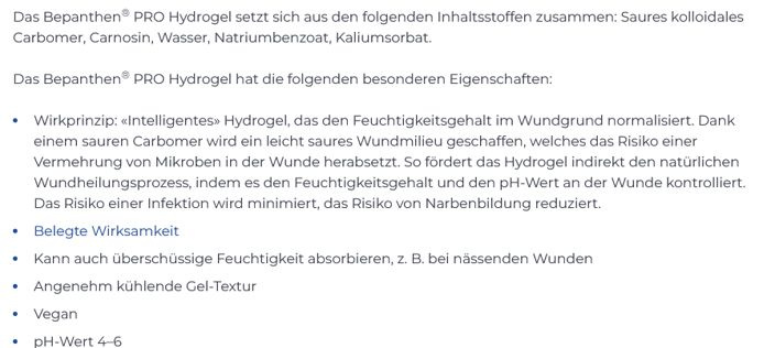 Das Bepanthen® PRO Hydrogel ist ein Brand- und Wundgel zur feuchten Wundbehandlung. Für eine gute Wundheilung ist es sinnvoll, die Wunde während der Heilung feucht zu halten, z. B. mit einem Hydrogel. Eine bestimmte Menge an Feuchtigkeit ist für die Wundheilung von grosser Bedeutung, da sie eine ideale Umgebung für eine erhöhte Vermehrung von Hautzellen (neue Hautschicht) bietet.