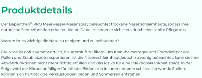 Der Bepanthen® PRO Meerwasser-Nasenspray enthält Meersalz als isotonische wässrige Lösung. Diese trägt zu einer schonenden Reinigung der Nasenschleimhaut bei, ohne sie dabei auszutrocknen. Zudem