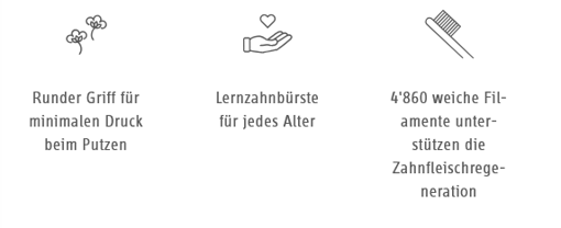 Die Lernzahnbürste für minimalen Druck auf Zähne und Zahnfleisch, fördert den Regenerationsprozess.