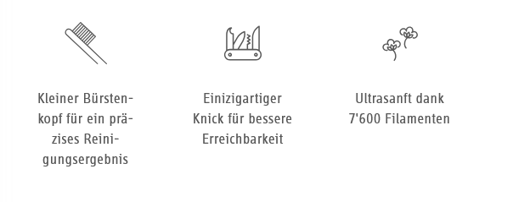 Sieht aus wie die Grosse, doch der Bürstenkopf ist extra klein. Eigentlich eine Sensation: Über 7'600 Filamente stehen dicht an dicht. Da lässt es sich besonders präzise putzen.