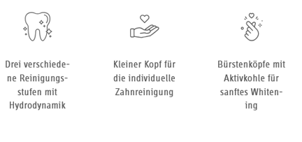 Die Schallzahnbürste Black is white Hydrosonic beeindruckt durch ihr mattschwarzes Auftreten. Schwarz sind auch die Bürstenköpfe: Aktivkohle-Partikel, sie saugen Zahnverfärbungen auf, sanft.