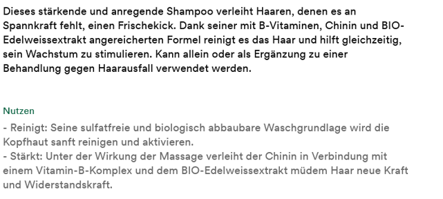 Das Shampoo mit Chinin & BIO-Edelweiss ist eine wahrhaft stimulierende Kur, die dem müden Haar Kraft und Vitalität zurückgibt.