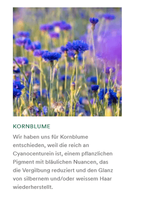 Unser Shampoo mit BIO-Kornblume verleiht grauem, weissem oder platinblondem Haar neuen Glanz, indem es Gelbfärbungen sofort neutralisiert.