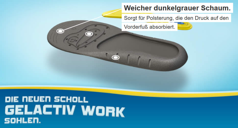 Die neue Scholl GelActiv Technologie besteht aus einer Kombination aus zwei Gelarten, die nachweislich kleinste Stöße dämpfen und beim Gehen und Laufen den entstehenden Druck effektiv reduzieren. Das festere Gel unterstützt das Fußgewölbe und die Ferse, während das weichere Gel für optimale Polsterung sorgt und stoßdämpfend wirkt.