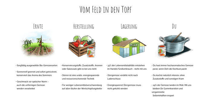 Lufttrocknung oder Dörren ist eine uralte und schonende Konservierungsmethode. Das Aroma der Gemüsesorten wird dabei intensiviert und beim Kochen ziehen die Gemüsewürfel Flüssigkeit, so dass sie von frisch geschnittenem Gemüse nicht zu unterscheiden sind. Geschmacksexplosion durch Dörren.