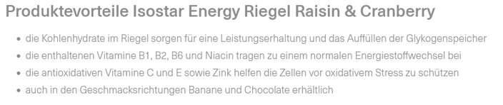 Isostar Energy Riegel Raisin & Cranberry ist ein kohlenhydrathaltiger Sportriegel mit wertvoller Energie für vor oder während dem Sport. Der Energieriegel ist praktisch für unterwegs und ein idealer Energielieferant für sportliche Aktivitäten. Auch in anderen Geschmacksrichtungen erhältlich.