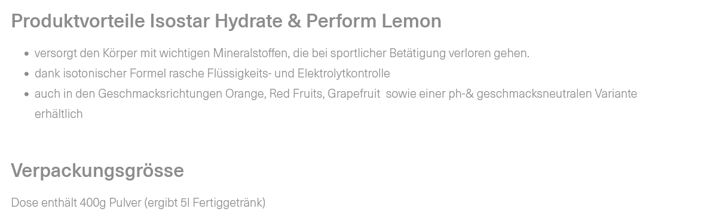 Isostar Hydrate & Perform Lemon ist ein Pulver zur Herstellung eines Kohlenhydrat-Elektrolytgetränks. Das isotonische Getränk ist vor, während und nach dem Sport geeignet. Mit dem