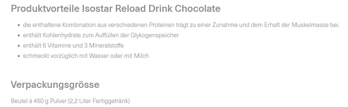 Das Isostar Reload After Sport ist ein Pulver zur Herstellung eines Getränkes mit hohem Kohlenhydratgehalt, Protein und Vitaminen. Das schmackhafte Getränk unterstützt die Regeneration nach intensivem Training und Wettkampf. Dank dem intensiven Schokoladengeschmack ist es ein bekömmlicher Shake nach sportlichen Aktivitäten.