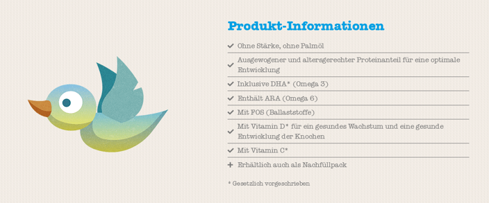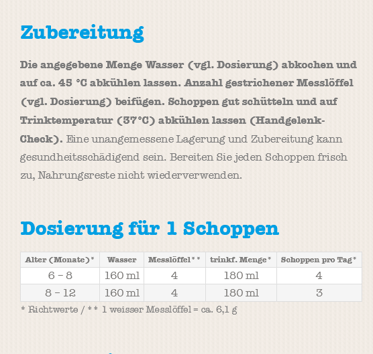 Zutaten: Maltodextrin, pflanzliche Öle (Sonnenblumenöl, Kokosnussöl, Rapsöl), Sojaproteinisolat, Mineralstoffe (Calciumphosphat, Kaliumcitrat, Calciumhydroxid, Kaliumchlorid, Natriumphosphat, Magnesiumchlorid, Calciumchlorid, Calciumcitrat, Natriumcitrat, Eisensulfat, Kaliumhydroxid, Zinksulfat, Kupfersulfat, Kaliumjodid, Natriumselenit, Mangansulfat), Fructo-Oligosaccharide (FOS), Inulin, Emulgatoren (Lecithin, Mono- und Diglyceride von Speisefettsäuren), Öl aus der Mikroalge Schizochytrium sp. Mortierella alpina-Öl, Vitamine (Vitamin C, Niacin, Vitamin E, Pantothensäure, Vitamin D, Vitamin A, Riboflavin, Vitamin B6, Thiamin, Folsäure, Vitamin K, Biotin, Vitamin B12), Cholinchlorid, Inositol, Taurin, Nukleotide (CMP, UMP, AMP, IMP, GMP), Antioxidationsmittel (Ascorbylpalmitat, stark tocopherolhaltige Extrakte), L-Carnitin.