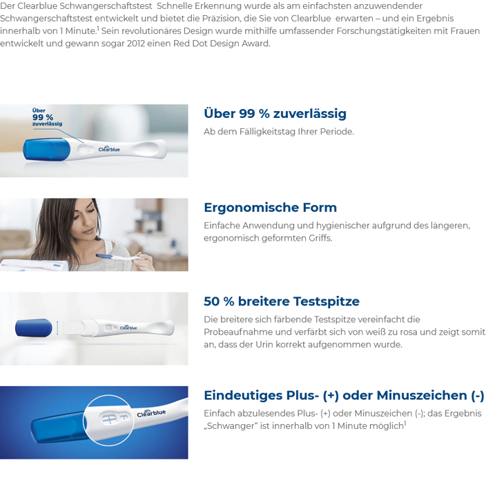 Der Clearblue Schwangerschaftstest Schnelle Erkennung wurde als am einfachsten anzuwendender Schwangerschaftstest entwickelt und bietet die Präzision, die Sie von Clearblue erwarten – und ein Ergebnis innerhalb von 1 Minute.1 Sein revolutionäres Design wurde mithilfe umfassender Forschungstätigkeiten mit Frauen entwickelt und gewann sogar 2012 einen Red Dot Design Award.