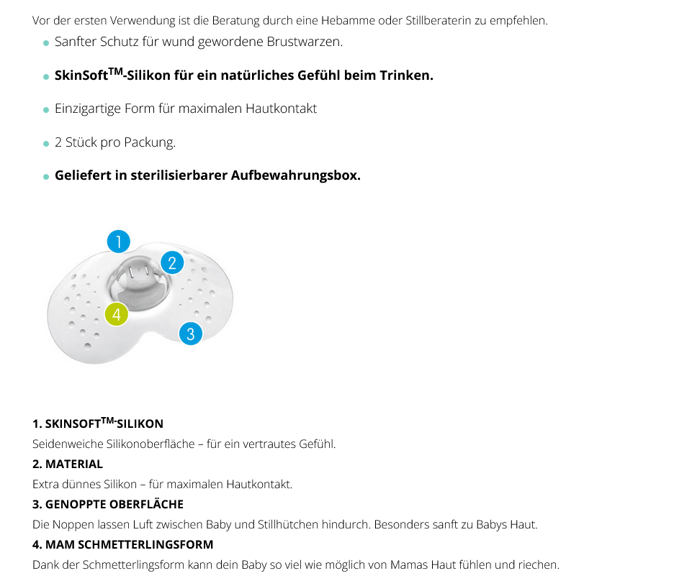 MAM Stillhütchen bieten kurzfristig Unterstützung beim Stillen. Trinken geht damit für Babys ganz leicht, weil sie sich so vertraut anfühlen. Grund dafür ist die seidig weiche Oberfläche und ihre natürliche Form.