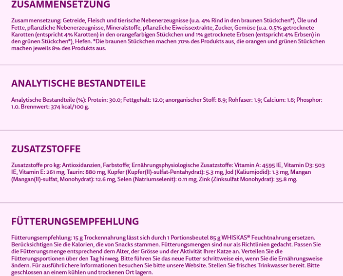 Unsere leckeren WHISKAS® 1+ Knackits mit Rind werden sorgfältig zubereitet, um deiner Katze alles zu geben, was sie zum Schnurren braucht. Hergestellt aus hochwertigen Zutaten, die nur von vertrauenswürdigen Lieferanten bezogen werden. Unsere köstlichen Rezepte sorgen dafür, dass deine Katze glücklich und gesund bleibt & bei jeder Mahlzeit zum Napf rennt. Die Textur dieses hochwertigen Trockenfutters unterstützt die Zahnpflege deiner Katze durch einen sanften Abriebeffekt. Hochwertiges WHISKAS®-Trockenfutter für Katzen ab 1 Jahr, das auf die Bedürfnisse deines Lieblings abgestimmt ist. Das schmackhafte und ausgewogene Adult Katzenfutter mit Rind kommt im 3,8kg-Beutel.