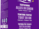 – MAXI: eine grosse 75 ml Ausführung erlaubt es, 400g Textilien in dunklem Farbton zu färben.