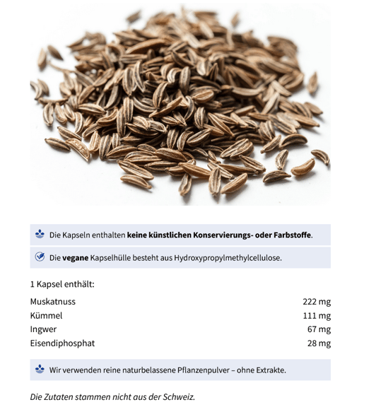 Kräuterkapseln mit naturbelassenem Muskat, Kümmel, Ingwer und Eisen.
