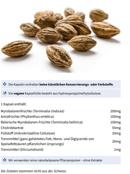 Kräuterkapseln mit drei Myrobalanen-Früchten und Cholin.