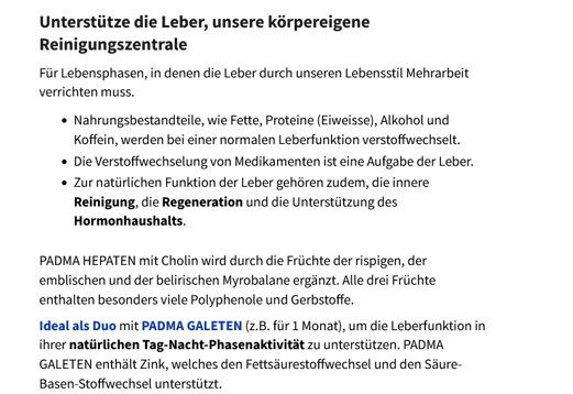Ideal als Duo mit PADMA GALETEN während eines Monats. In der Kombination werden am Morgen 2 Kapseln PADMA GALETEN und am Abend 2 Kapseln PADMA HEPATEN empfohlen.