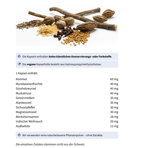 Kräuterkapseln mit Magnesium. Ergänzt mit zehn Pflanzen, unter anderem mit der fest in der Erde verwurzelten Süssholzwurzel und dem balsamisch riechenden indischen Weihrauch.