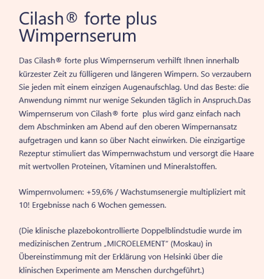 Sie wünschen sich einen dichteren und längeren Wimpernkranz, um Ihren Augenaufschlag noch verführerischer zu gestalten? Dann setzen Sie auf das Cilash® forte plus Wimpernserum. Es sorgt für ein natürliches, gesundes Wachstum der kleinen Härchen und verleiht ihnen mehr Schwung.