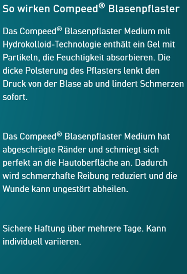 Das Compeed® Blasenpflaster Medium nimmt überschüssige Wundflüssigkeit auf und bildet ein schützendes Polster. Es lindert Schmerzen sofort und bietet die ideale Umgebung für schnelle und feuchte Wundheilung. Verfügbar in verschiedenen Packungsgrößen.
